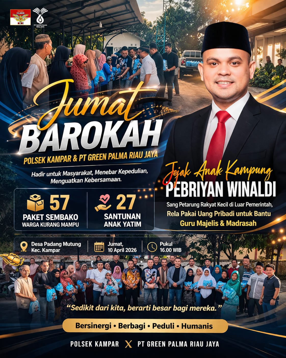 Nuansa haru dan kebersamaan terasa kental di Desa Padang Mutung, Kecamatan Kampar, Jumat (10/04/2026) sore. Melalui kegiatan “Jumat Barokah”, Polsek Kampar bersama PT Green Palma Riau Jaya menyalurkan bantuan sosial kepada masyarakat kurang mampu serta santunan bagi anak yatim.